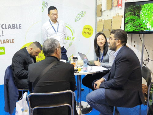 展會現場,龐度環保展臺前參觀咨詢的客商絡繹不絕,還收到了來自多個國家和地區的訂單洽談。龐度環保(展位:7.2A42-6)參展團對來賓提出的問題和需求進行耐心而專業的解答,竭誠為每一位顧客提供優質的服務,滿足客戶需求,呈現龐度環保包裝產品的特色及優勢。